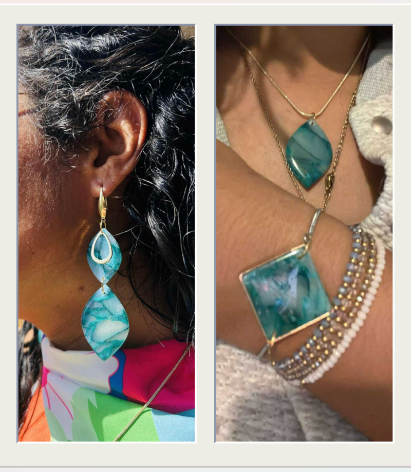"J'aime beaucoup les bijoux Clay'sential. C'est un moyen facile d'ajouter une étincelle à une tenue autrement simple. Ils sont légers. Et cette parure spéciale créé pour moi à ma demande"